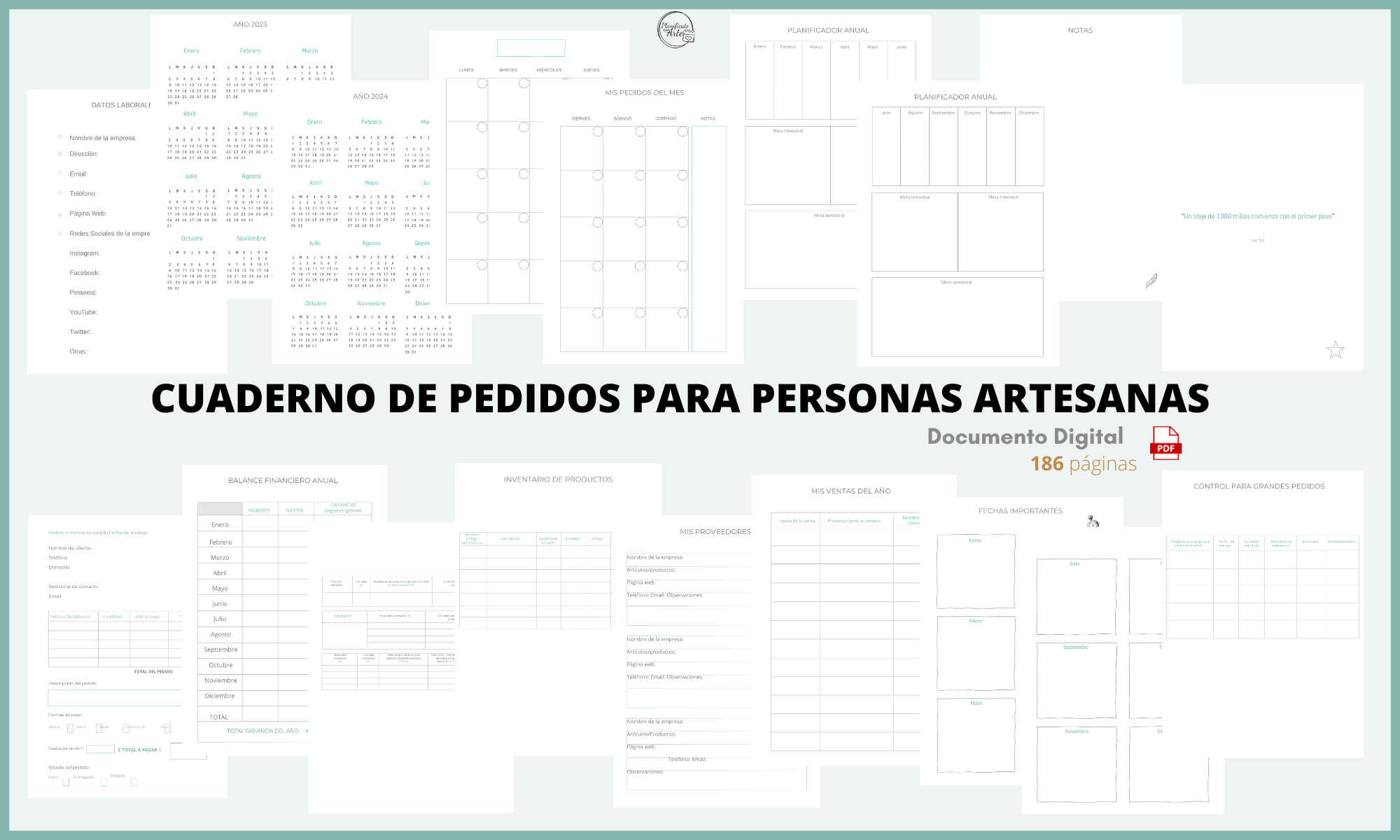 Este cuaderno de pedidos está diseñado para ayudarte en el día a día de tu negocio. Con él podrás organizar tus pedidos mensuales de manera eficiente, llevar el control de tus productos, anotar tu lista de proveedores, de clientes, llevar el balance financiero mes a mes para evitar sustos, registrar todas las compras y las ventas del año sin que te arda la cabeza, tener fichas de registro para tus clientes, planificarte como una diosa durante todo el año y mucho más.