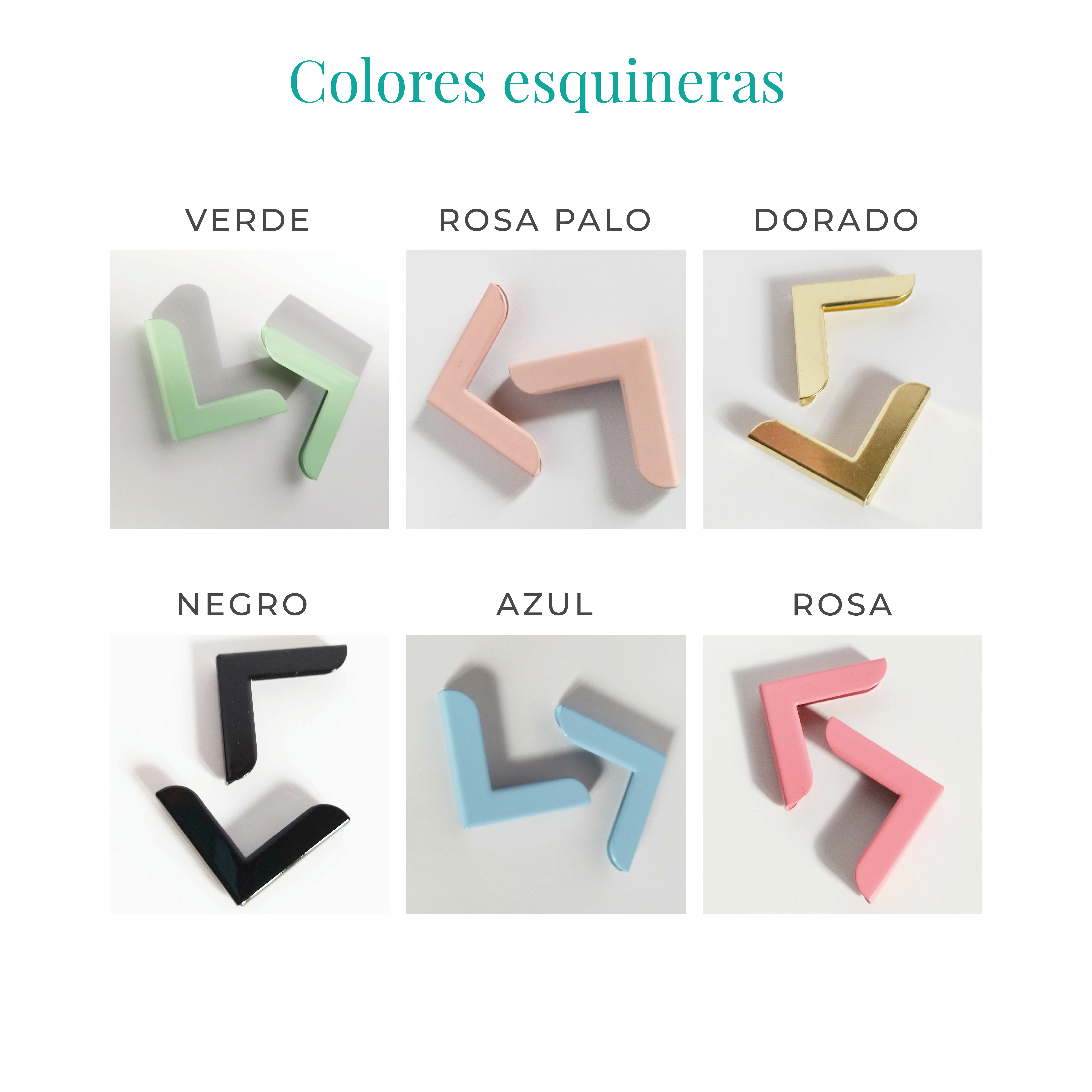 | Color esquineras | Azul, Dorado, Negro, Rosa, Rosa palo, Verde |